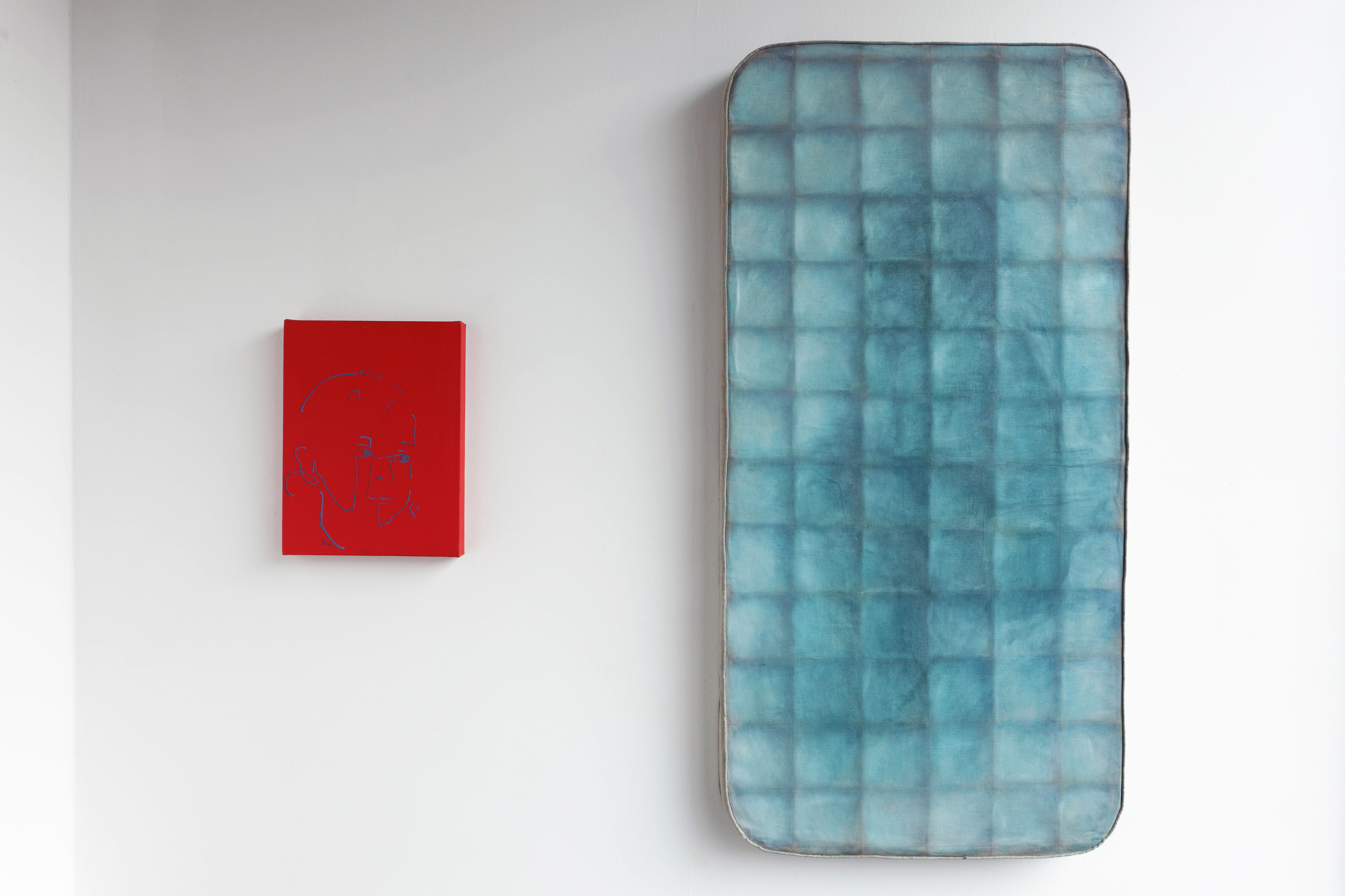 As a child, our first impression of adulthood comes from looking up to our parents. We begin dreaming up futures for ourselves when young, which later form into realities that, more often than not, have been influenced by the environment we were nurtured in. Based off a small mattress Leon Scott-Engel would sleep on as a child in his mothers studio, To the Moon and Back (2025) holds with it this subtle nostalgia from the artists childhood. Entitled after a common phrase often spoken when saying goodnight, it holds with it a soft impression of the hope, dreams and love that a parent passes onto their child, reflected on the sleeping figure in shimmery moonlit blues.